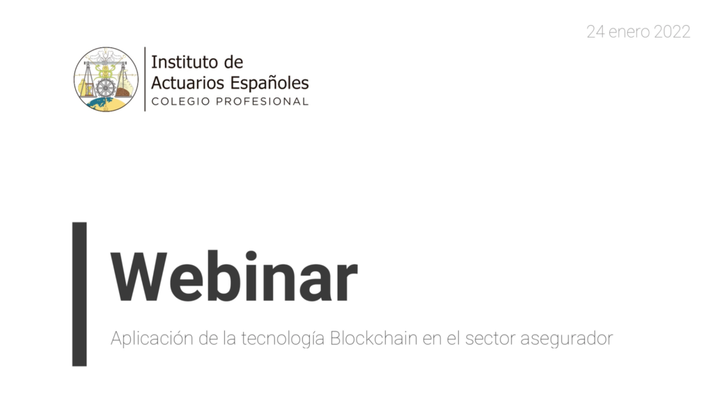 Webinar “Aplicación de la tecnología Blockchain en el sector asegurador” Ponente Rubén Nova. Actuario. Consultor actuarial en Milliman. Vicepresidente de la Federación Nacional de Digitalización y Blockchain. Fecha y lugar Fecha: 24 enero 2022 – 18h Lugar: Aula virtual de formación del Instituto de Actuarios Españoles Idioma: Español Duración: 1h (reconocido con 1h de CPD …