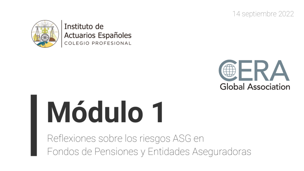 Webinar “Reflexiones sobre los riesgos ASG en Fondos de Pensiones y Entidades Aseguradoras (Módulo 1 Sesiones CERA 2 del IAE)” Ponentes Moderador: Manuel Moreno – Actuario CERA IAE y Consultor ARM Actuarios Participantes: Mario E. Sánchez Richter, CIIA, Economista, Secretaría de Políticas Públicas y Protección Social en CS CCOO Andrés Herrero Martín, Unidad de Previsión …